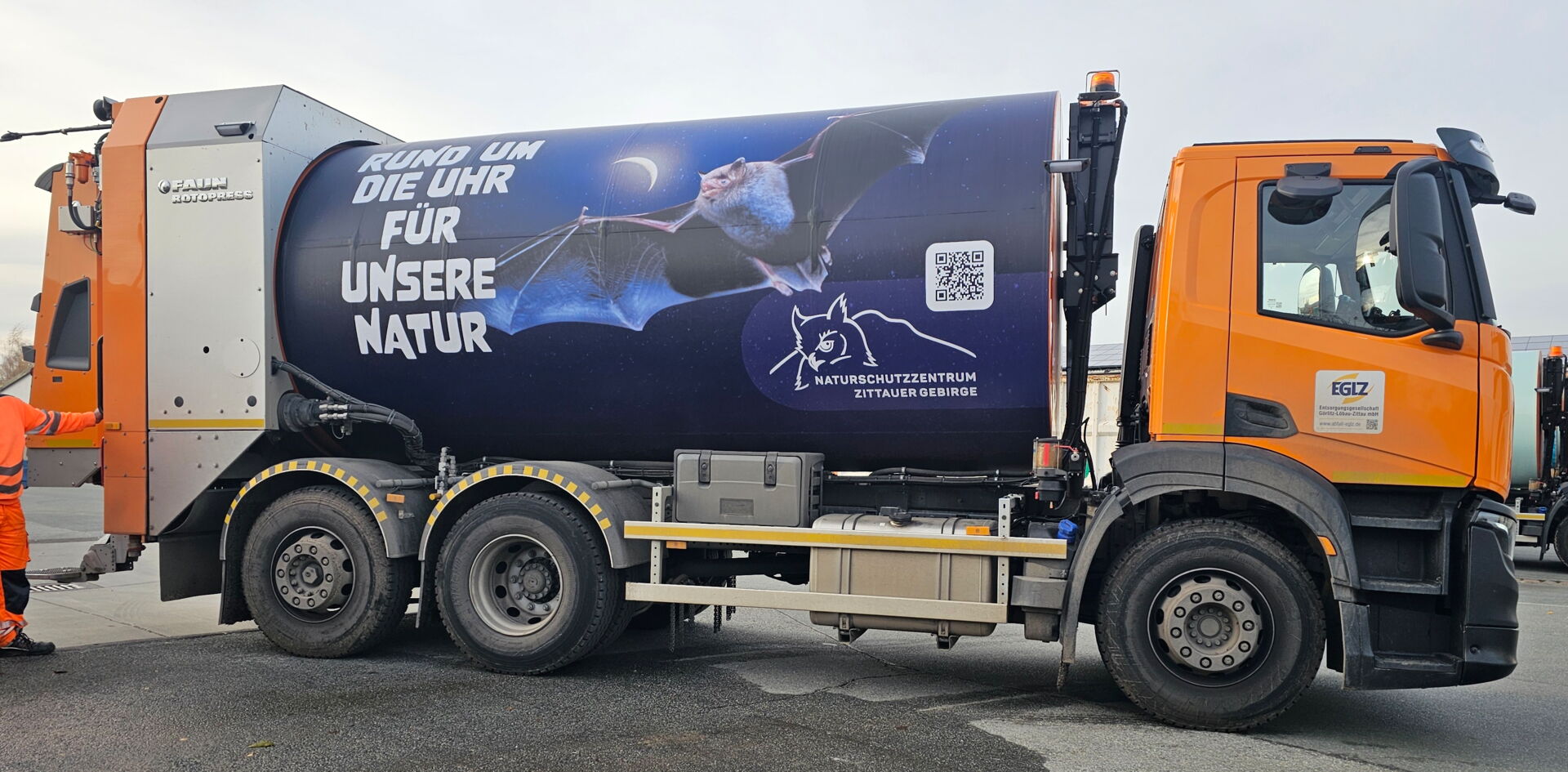 Das Naturschutzzentrum Zittauer Gebirge gGmbH als Unternehmen des Landkreises Görlitz präsentiert sich auf der rotierenden Trommel unseres IVECO S-WAY mit Aufbau FAUN-ROTOPRESS mit der Werbebotschaft "Rund um die Uhr für unsere Natur".